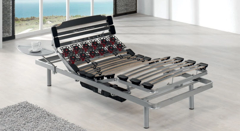 • Cinco planos articulados por motor doble con mando inalámbrico. Plano lumbar fijo, que a su vez incorpora doble lama, y cursores especiales para la regulación de firmeza.